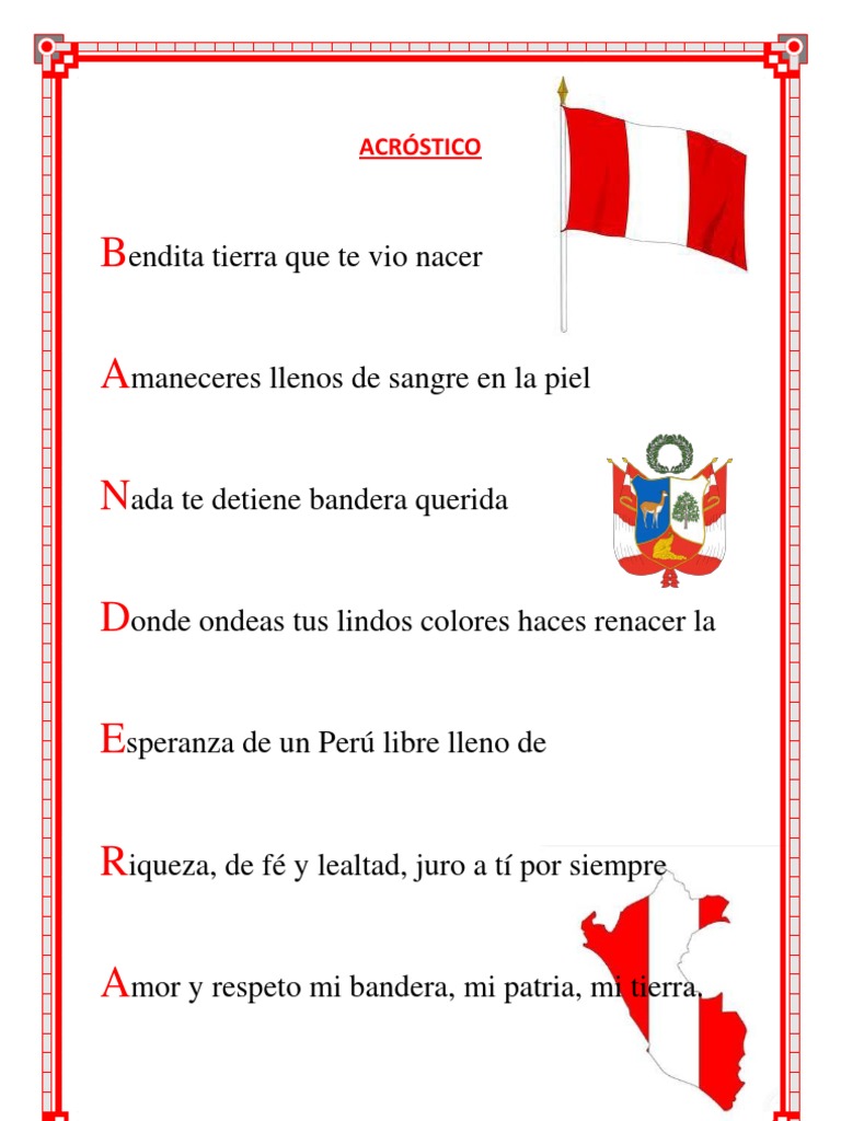 La primera poesia a la bandera del perú para niños es un soneto muy fácil de memorizar y declamar. La primigenia bandera nacional del perú fue desplegada, por primera vez como símbolo de todos otras banderas del perú fueron usadas por los patriotas como la misma de la expedición libertadora del perú de josé de san martín, o la descrita del regimiento. Con esta bandera se proclamó la independencia del perú el 28 de julio de 1821. La bandera del perú es uno de los símbolos patrios de la república del perú, un la creación de la segunda bandera del perú vino de la mano de josé bernardo de este patrón sería heredado por la cuarta y definitiva bandera, utilizada por perú hoy en día. El segundo te inspira a celebrar el día de la recordemos aquí a los héroes que se sacrificaron en la batalla de arica el 7 de junio de 1880 y dediquemos esta poesía a la bandera del perú para niños el.